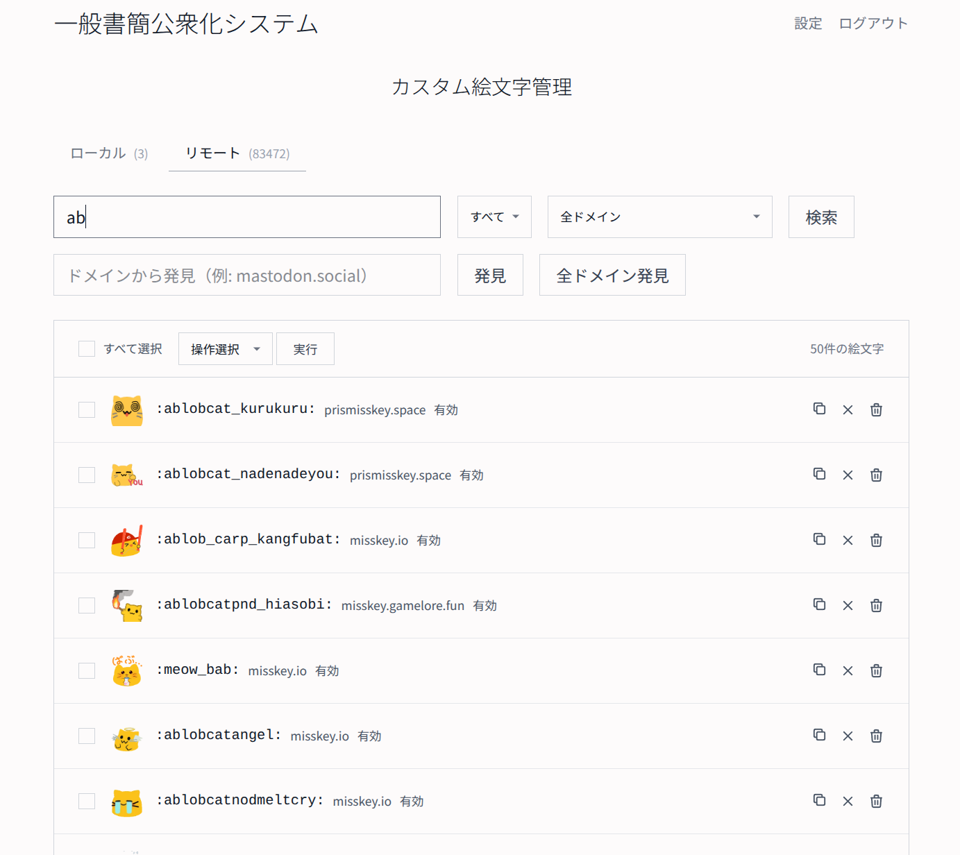 設定画面ではプロフィールの編集やリレーサーバ、カスタム絵文字の管理など、Web画面上の方が好ましいと思われる項目を厳選した。とりわけカスタム絵文字はFediverseがもたらした偉大な文明の一つである。技術的にはコロンで囲まれたショートコードをパースして画像に置き換えているだけだが、おかげでblobcatを初めとするすばらしい意匠がこの世界で花開いている。当然、Mastodonと同様に接触済みのインスタンスから絵文字をコピーする機能も設えた。