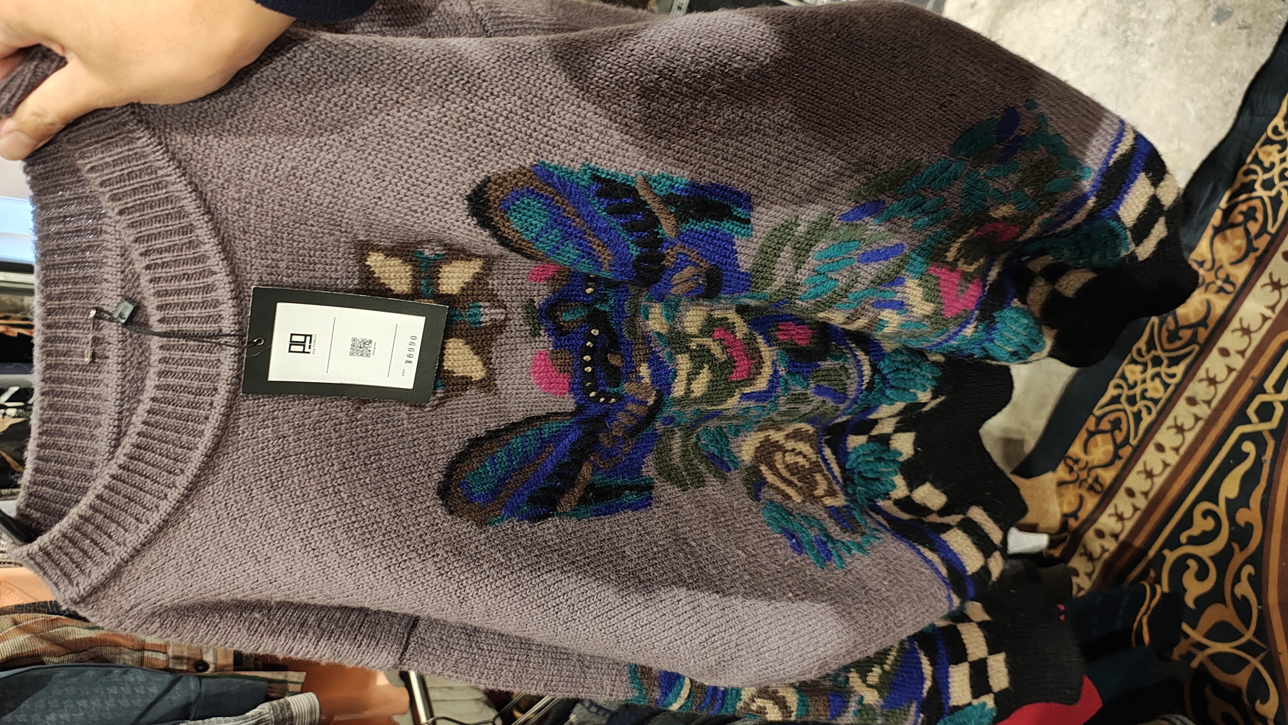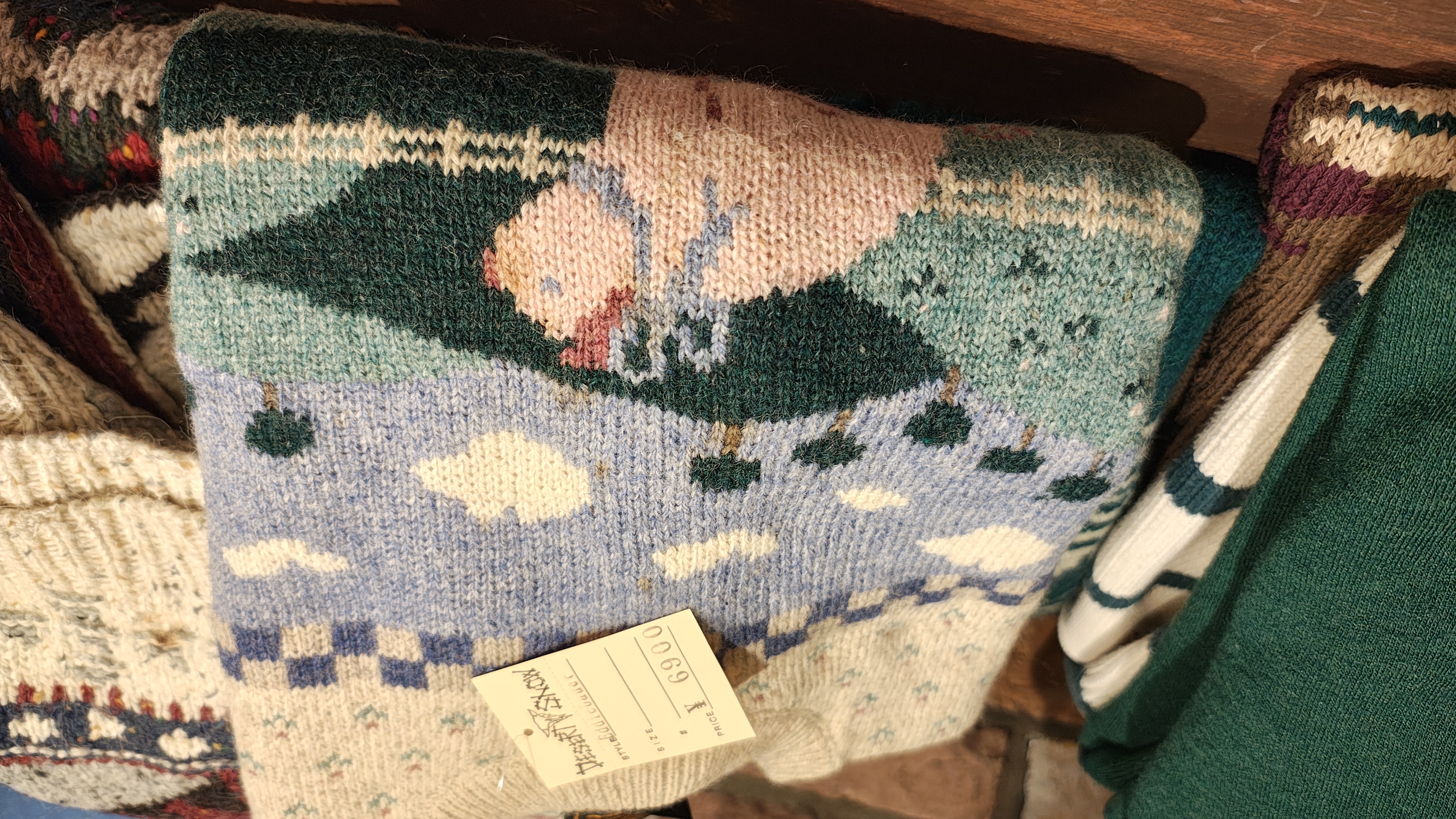 Youtubeで有名な古着屋『pug』では印象的な調度品に出迎えられ、ファッション学で修士号を得ていそうな前衛的な格好をした店員に用向きを問われた。率直に「ウール100%のローゲージニットが欲しい、変な柄だとなお良し」と要求したところ、以下の服がワードローブの森の奥地から出てきた。悪くはない。特に2枚目はちゃんとローゲージで手編みでイングランド製だった。しかし2万3000円もするという。柄は可愛いが値段は可愛くない。