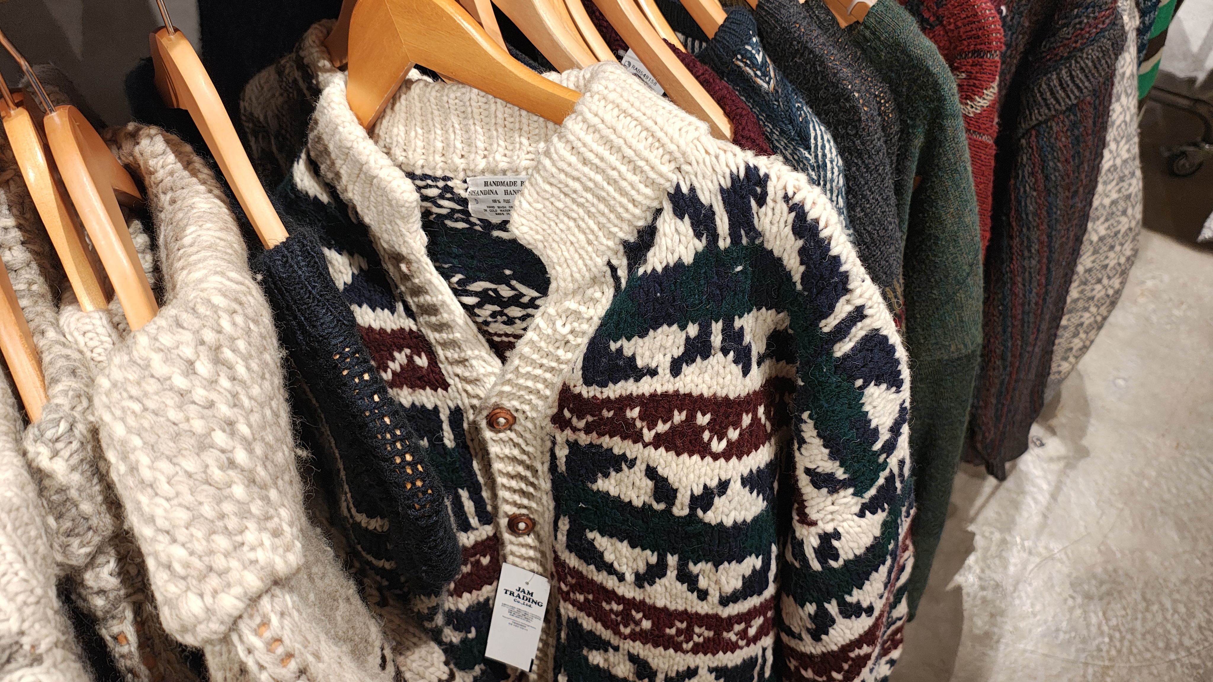 さっそく入店すると、清涼感と湿気臭さが同居した独特の匂いが鼻腔をくすぐる。結局これがなんの匂いなのか見当がつかず、誰もが「古着屋の匂い」と怠惰なトートロジーに甘んじている。きっと卓越した人物がいつか当意即妙な語彙をもたらしてくれるのだろう。入口に飾られたヴィンテージ価格のアメカジアイテムをやり過ごし、レジの前に並べられたジャーマントレーナーに目を奪われつつも歩を進め、店舗の奥地にたどり着くとそこにニットが並べられている。