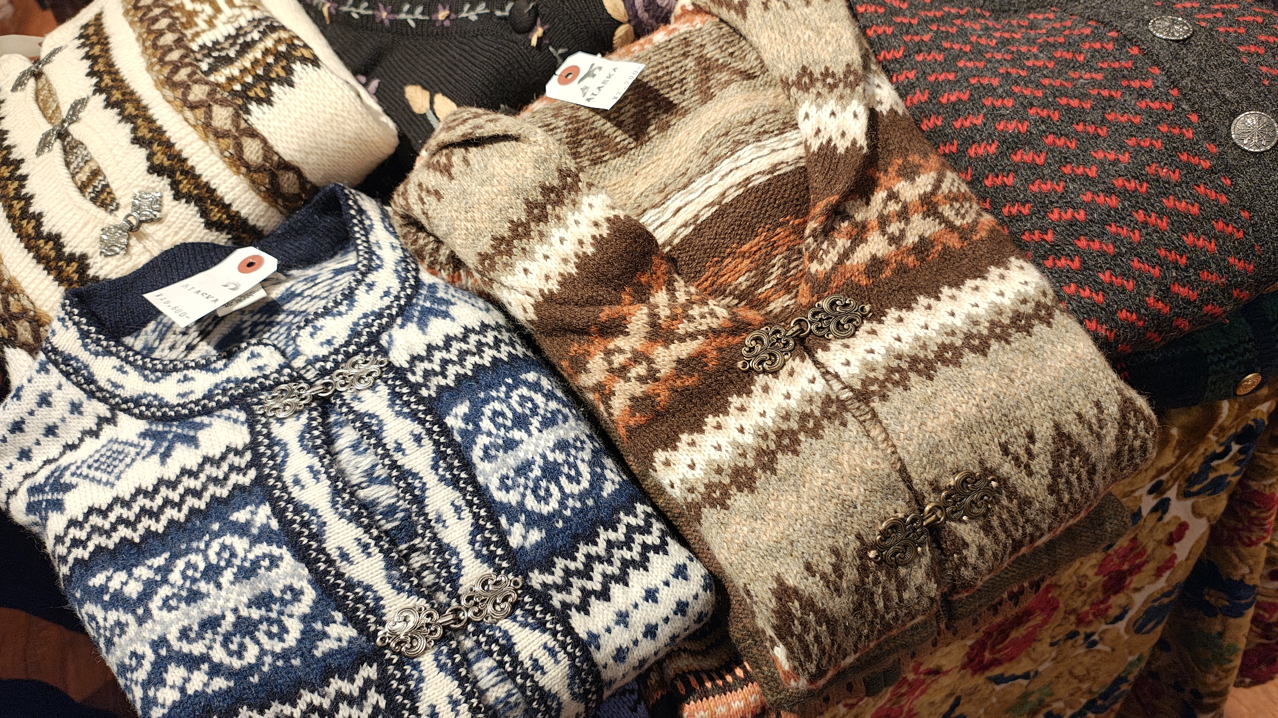 同じ要領で2日目も探したが、結局買わなかったものが多い。たとえば以下の1枚目はほぼ理想に適っていたが、ボタンをかける部分が壊れていた。2枚目はなかなかブタサンダーな見た目で可愛かったが、ウールではなかった。3枚目は美品すぎて高かった。大量の古着が日夜投入される街でも、自分の条件に見合う服は案外見つからない。