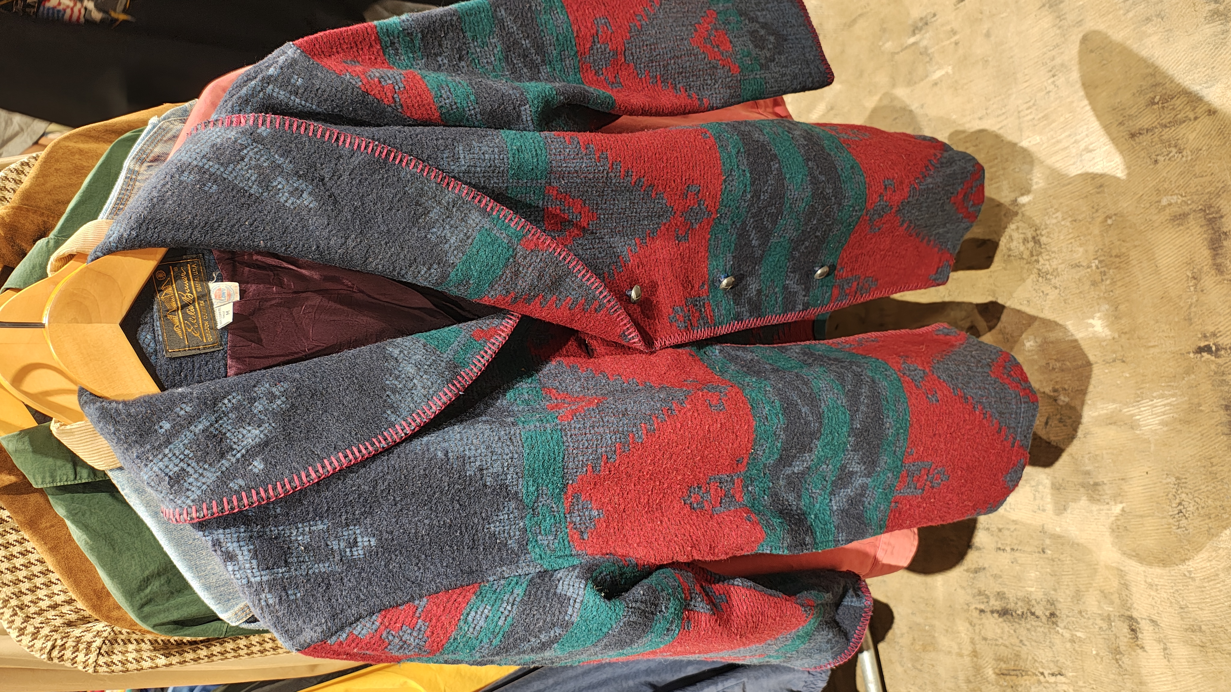 一方、デザートスノーの中二階で見つけたこれは、ニットではないハーフコートなのに買ってしまった。なんとしても変な柄成分を獲得したかったのかもしれない。絨毯みたいな触り心地のウール生地で十分に分厚く、これはこれで部屋で着るのに悪くない。タグ曰く、かつてアメリカで織られた服らしい。本来はキャンプなどの時に着る屋外用の防寒具なのだろう。