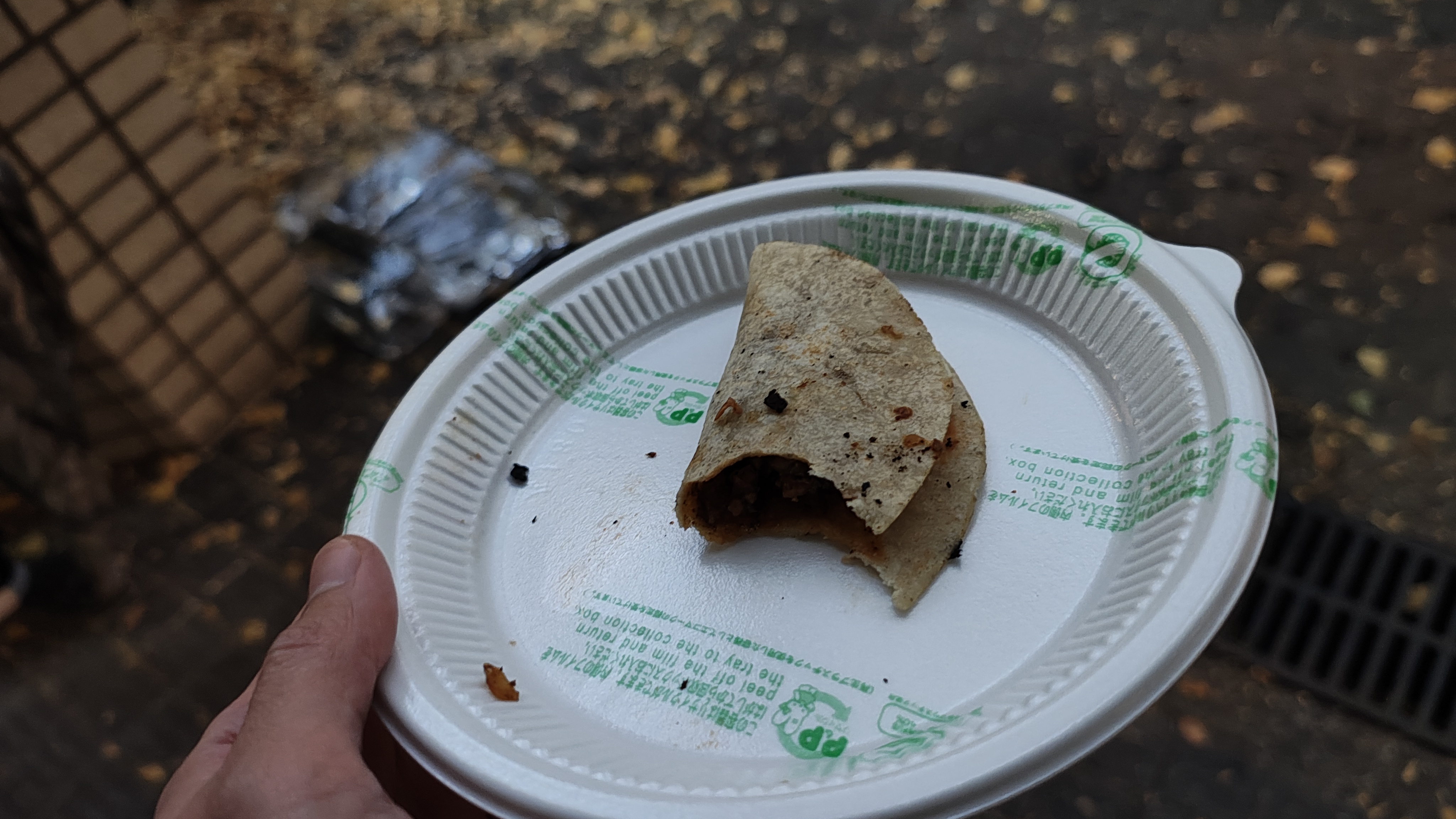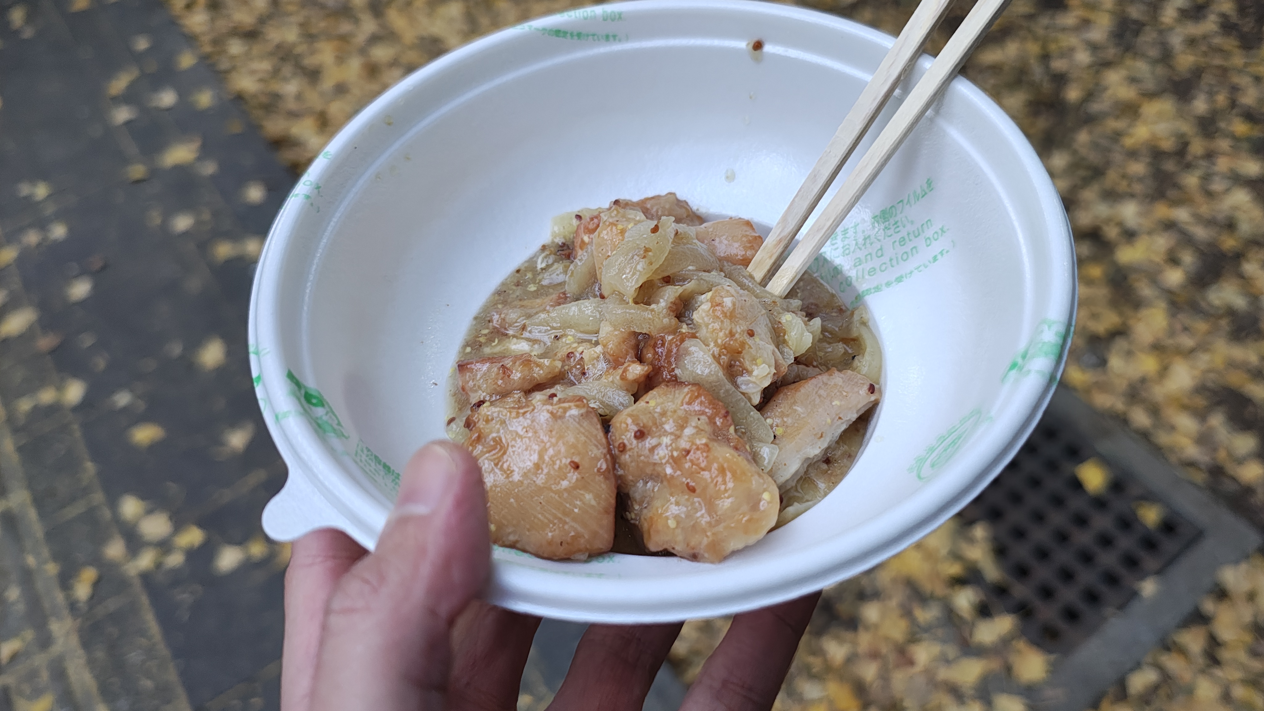 食べた感じとしては酸味が強めの鶏肉のシチューといった具合だった。なかなかおいしい。しかし当然ながら量が少ない。もう一品なにか、と周囲をうろついていると「ただいまより当店のタコス一〇〇円!」と叫ぶ学生の声が耳に入った。気づいたら列に並んでいた。処分価格とはいえ一〇〇円で売れるタコスとは果たしていかなるものか。
