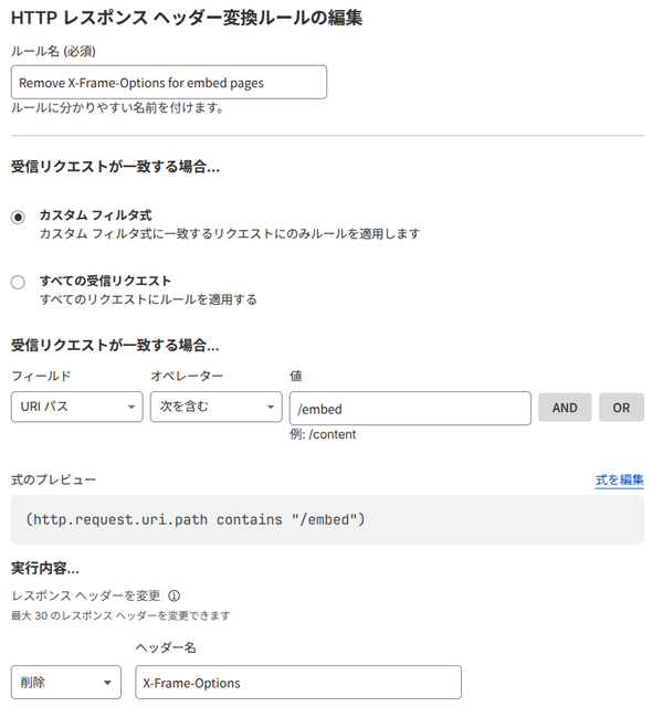 Cloudflare絡みでいくつか引っかかった点があったので共有したい。まず、投稿埋め込み機能を実装する都合上、Rails側でX-Frame-Optionsを許可しなければならないが、Cloudflare側でも同様のルールを作成しておかないと弾かれてしまう。Cloudflareのトップページからドメイン → ルール → 概要に進んで「レスポンスヘッダー変換ルール」から以下の要領で作成する。