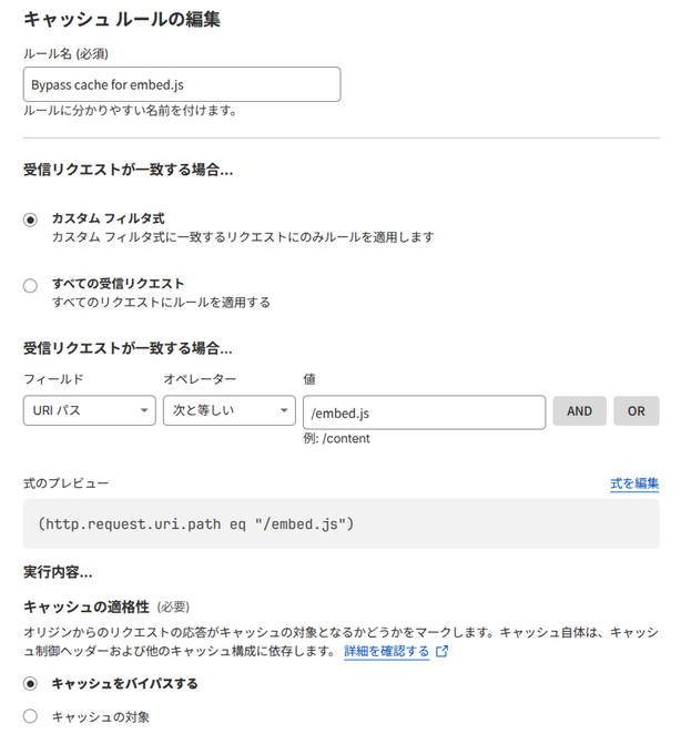 次に、投稿埋め込み機能のJavaScriptがキャッシングされると更新しても古いスクリプトが動き続けてしまうので、同じく「キャッシュルール」から以下の要領で/embed.jsをキャッシュの例外に設定する。以上で問題が解決される。